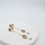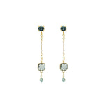 Their sleek profiles are highlighted by aqua studs that cascade down to gold-tone chains, with adornments of micro pearls and smoke square drops.