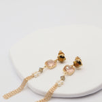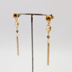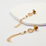 Bronze sport dangling peach square stones, giving way to micro pearls and gold fringe chains that are begging for the dance floor.