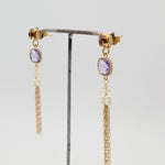 Adorned with glimmering studs and tanzanite square stones, they glimmer down to micro pearls with gold fringe.