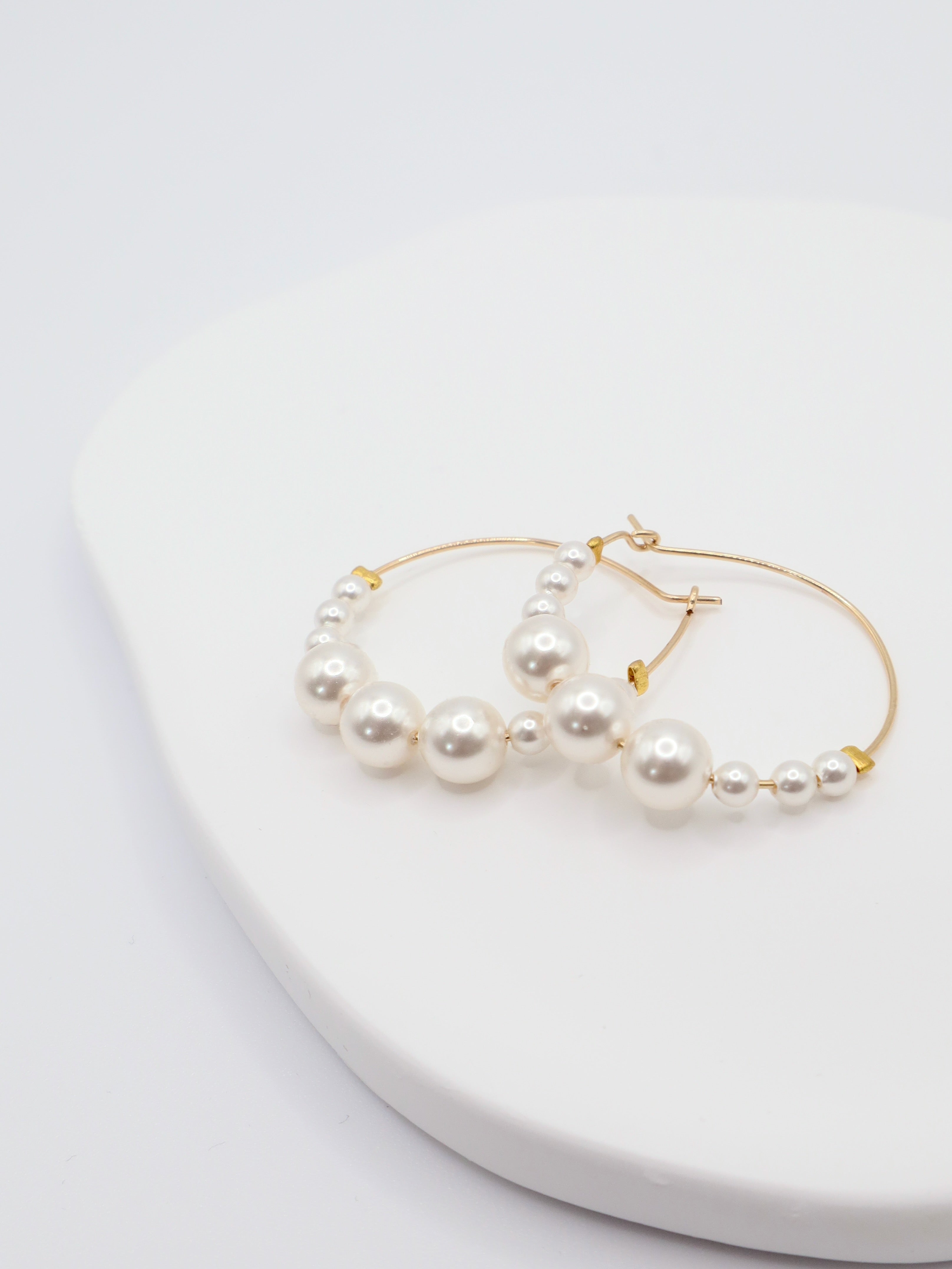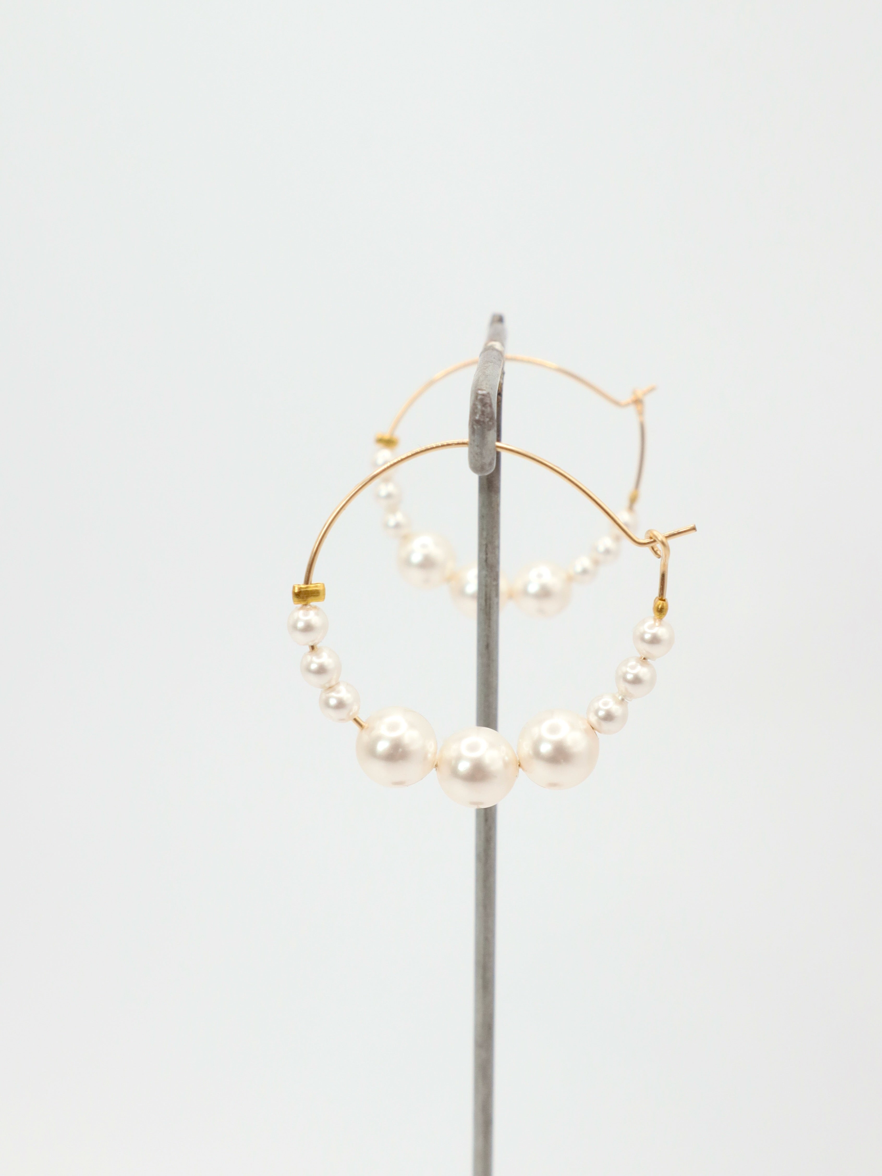 These gold-filled beaded hoops feature elegant white Swarovski pearls, combining classic charm with modern sophistication.